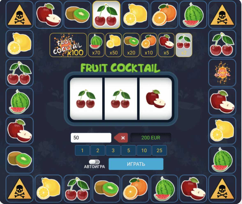 Fruit Cocktail – это яркая и разноцветная игра-слот, которая переносит игроков в мир сочных фруктов и больших выигрышей. Игра состоит из 5 барабанов и 9 линий выплат, и ваша задача – собрать комбинации из различных фруктовых символов. Каждый фрукт имеет свою стоимость, а специальные символы, такие как Wild и Scatter, помогут увеличить шансы на выигрыш и активировать бонусные раунды. Эта игра привлекает своей простотой, ярким дизайном и захватывающим игровым процессом, делая ее популярным выбором среди любителей слотов на платформе 1xGames.