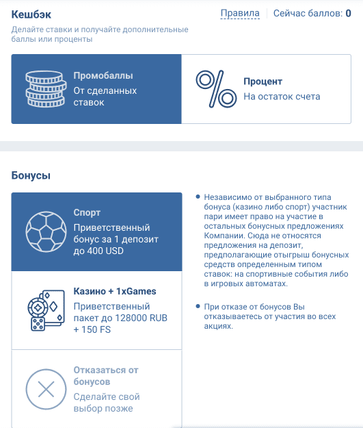 Перед пополнениям счета официального сайта 1xbet игроку нужно выбрать валюту. Она выбирается единоразово и изменить ее в дальнейшем будет невозможно.