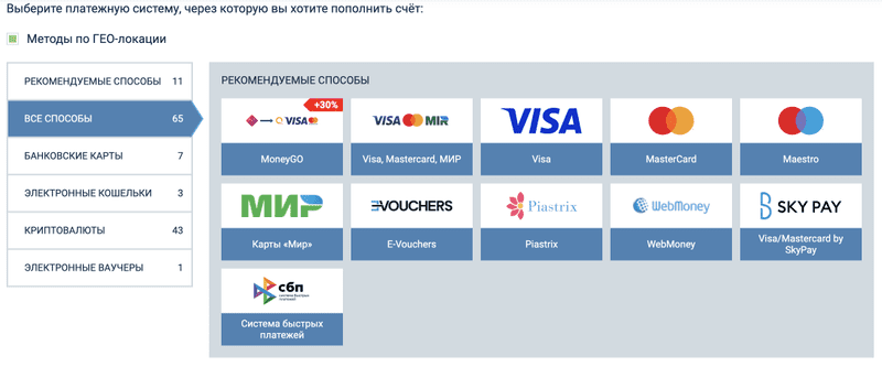 - Выбираем нужный способ оплаты: банковские карты, электронные кошельки, платежные системы, интернет банкинг или криптовалюты.