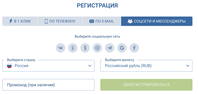 Чтобы зарегистрироваться на сайте 1xbet с помощью социальных сетей или мессенджеров, выберите соответствующую кнопку “Соцсети и мессенджеры” при регистрации: